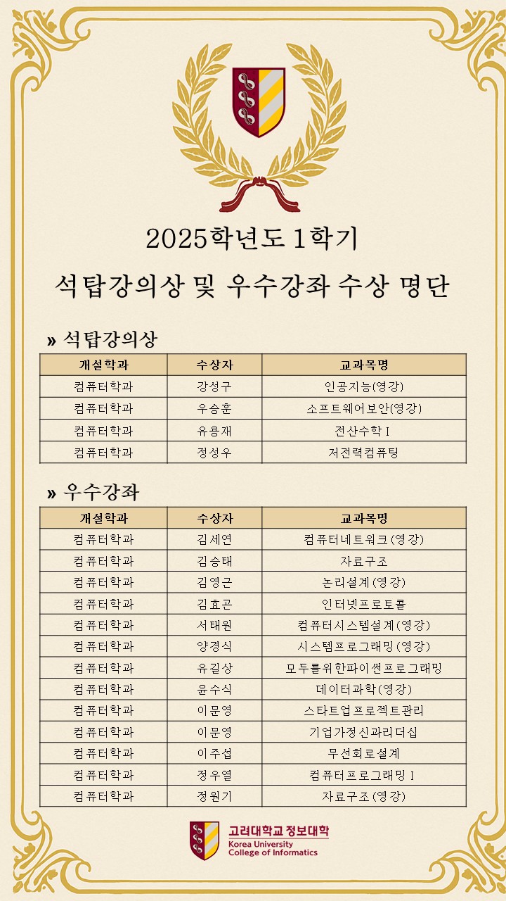 2025학년도 1학기 석탑강의상 및 우수강좌 수상 명단(정보대학)을 안내합니다.