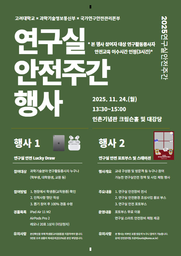 2025 연구실 안전주간 행사 진행 안내 - 일시: 2025.11.24.(월) 13:30-15:00 - 장소: 인촌기념관 크림슨홀 및 대강당 - 본 행사 참여자 대상 연구활동종사자 안전교육 이수시간 인정(3시간) |