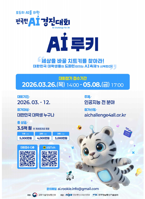 □ 행사 개요 o 대회명 : 전국민 AI경진대회 (대학생 트랙: 인공지능 루키대회) o 참가대상 : 전공 무관 대학생(만 34세 이하 학사학위 미소지자) o 예선 참가신청 마감 : ~ 5. 8.(금) o 대회 페이지 : 인공지능 루키 대회 □ 문의처 o 카카오톡 문의하기 : 카카오톡채널 - AI ROOKIE 운영사무국 |