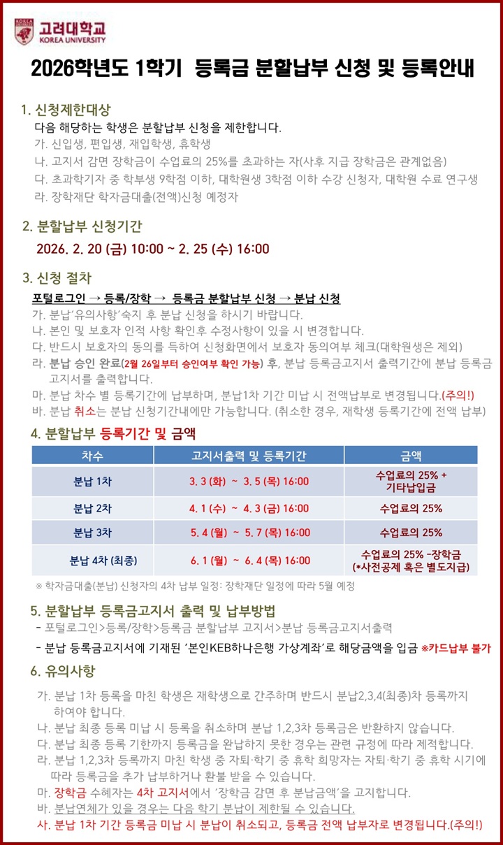 | 제목 | [등록] 2026년 1학기 대학(원) 등록금 분할납부 신청 및 등록 안내/2026-1 Students payment in installments(신청: 2/20~2/25, 납부: 3/3~3/5) |